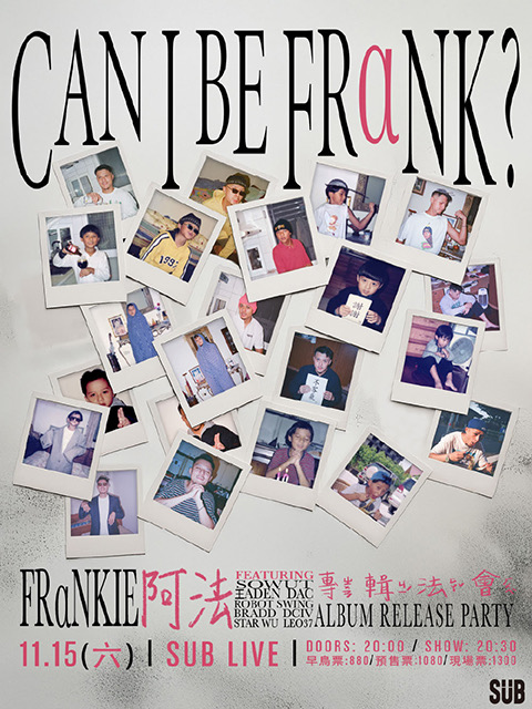 11/15 FRαNKIE阿法將與That’s My Shhh 團隊的ROBOT SWING、DAC、LEO37、STAR WU、DCIV、BRADD共同呈現「Can I be Frank?專輯法會」,也協同王ADEN、